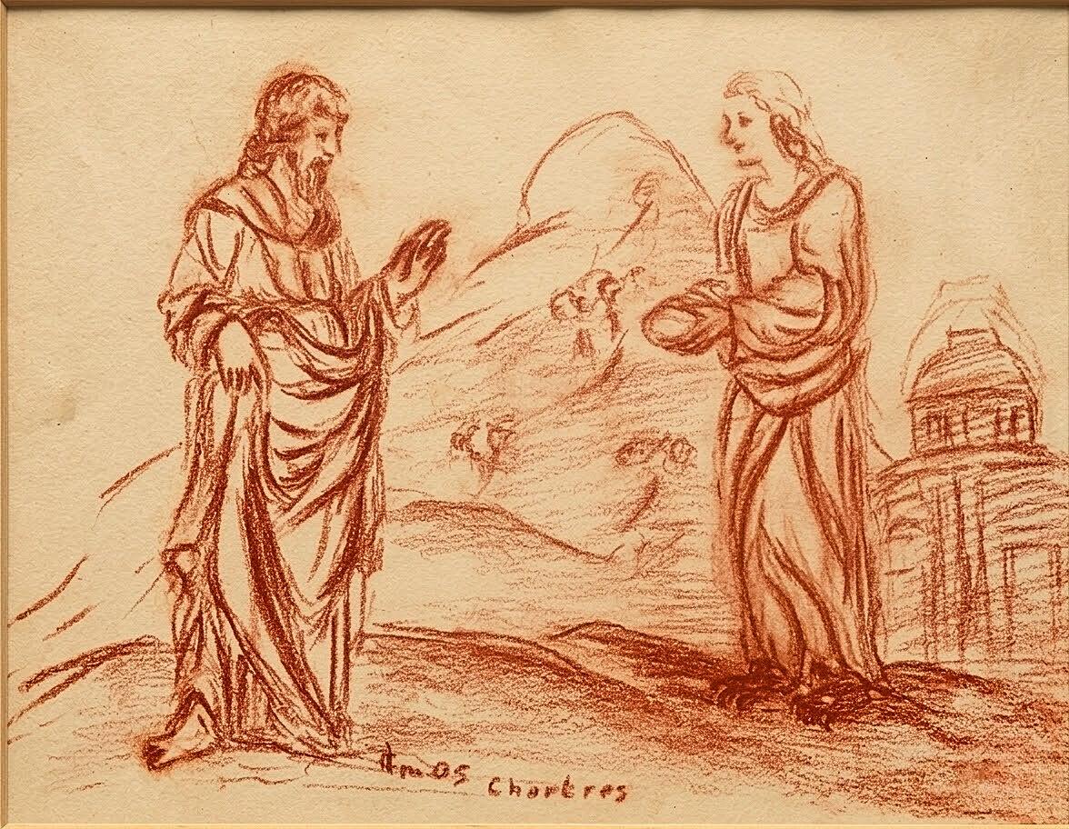 Cette étude à la sanguine s'attache à restituer la tension du face-à-face. Le trait souligne ici la duplicité du tentateur : une figure humaine dont la nature démoniaque se trahit par des pieds griffus, fidèlement repris du modèle historique. À l'arrière-plan, le temple esquissé en hachures légères ancre le récit dans sa topographie sacrée.
