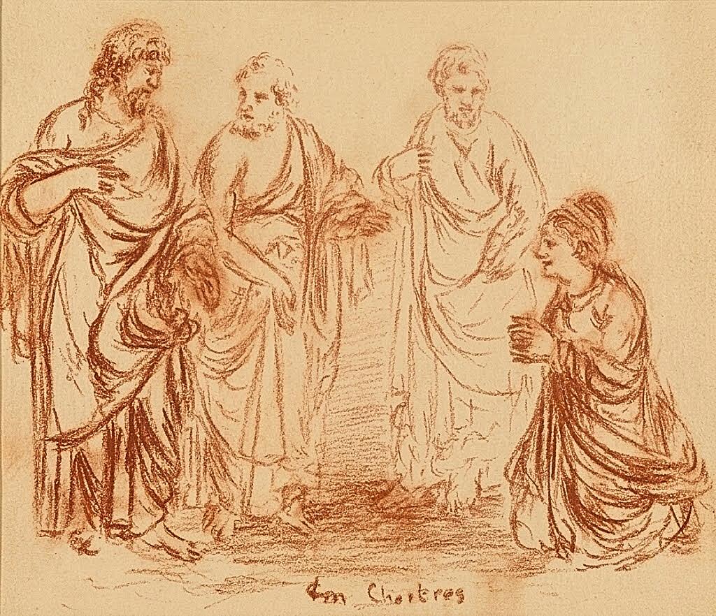 Cette étude à la sanguine restitue l'élégance maniériste du modèle à travers une modulation subtile du trait. Tandis que le Christ et la Cananéenne s'imposent au premier plan par une ligne ferme et dense, les apôtres s'estompent dans des contours plus légers, créant une profondeur qui concentre l'émotion sur le miracle. Ce jeu de plans souligne la maturité du style de Guybert, où chaque drapé accompagne le mouvement de la foi.