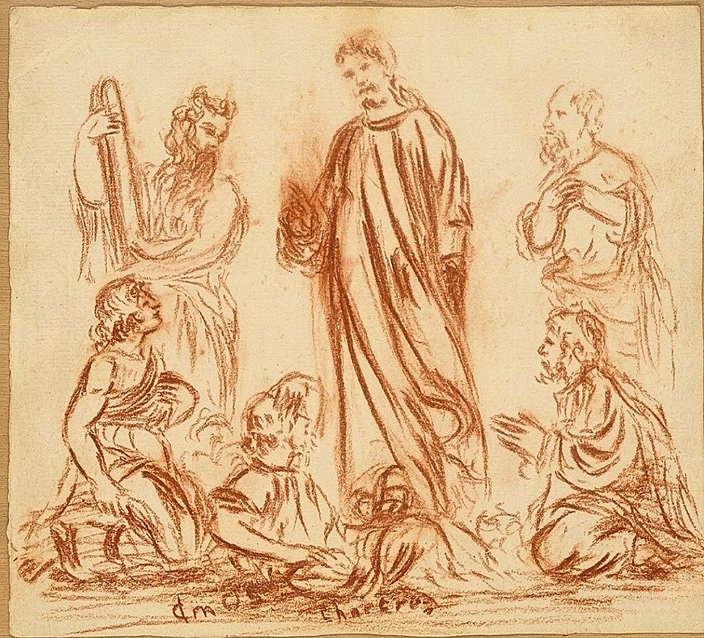 Cette étude à la sanguine met en lumière la hiérarchie céleste du mont Thabor. L'art du trait se fait ici volontairement sélectif : le Christ au corps étiré ( typique du courant maniériste tardif) est dessiné avec des contours plus affirmés, lui conférant une présence souveraine au cœur de la scène. Autour de lui, les prophètes Moïse et Élie, ainsi que les apôtres terrassés au sol, s'effacent dans une ligne plus ténue.