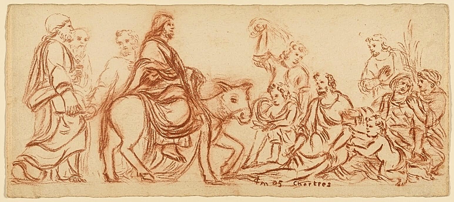 Cette étude à la sanguine ouvre le cycle de la Passion. L'art du trait privilégie la figure centrale du Christ, dont les contours fermes contrastent avec la foule et les apôtres qui s'effacent en arrière-plan. La composition horizontale restitue le mouvement de la procession, où la souplesse de la ligne accompagne la ferveur des fidèles étendant leurs manteaux. Un hommage au classicisme de Mazière, où la précision du dessin capte la solennité de l'entrée royale à Jérusalem.