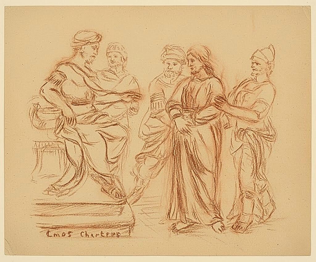 Fidèle à l'art du trait qui caractérise l'ensemble de ce cycle, cette sanguine s'attache à saisir la tension psychologique de la confrontation par la seule pureté de la ligne. Mon dessin explore la pose pensive de Ponce Pilate face à un Jésus captif mais dont la dignité est rendue par la fermeté du contour. En suivant l'œuvre de Simon Mazière de 1716, j'ai cherché à isoler les protagonistes du tumulte pour concentrer le drame sacré sur l'instant fatidique du jugement.