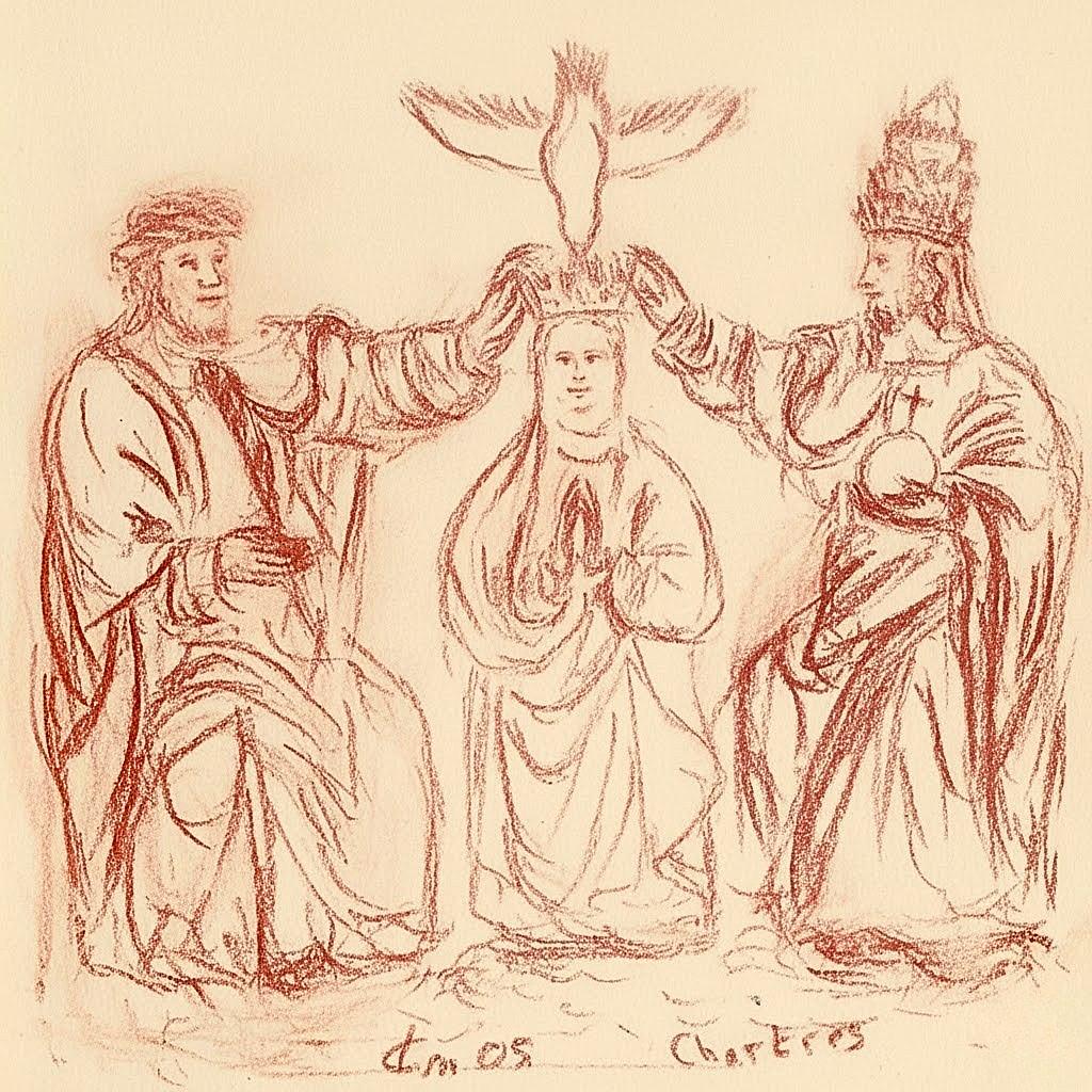 Dans cette ultime planche, mon dessin s'articule autour d'une structure trinitaire où la Vierge, au centre, reçoit la couronne des mains du Père et du Fils, sous l'égide de l'Esprit Saint. L'impression d'ensemble est celle d'une grande légèreté céleste, orchestrée par la descente verticale de la colombe, dont les ailes déployées semblent unir les trois figures divines dans un même souffle.