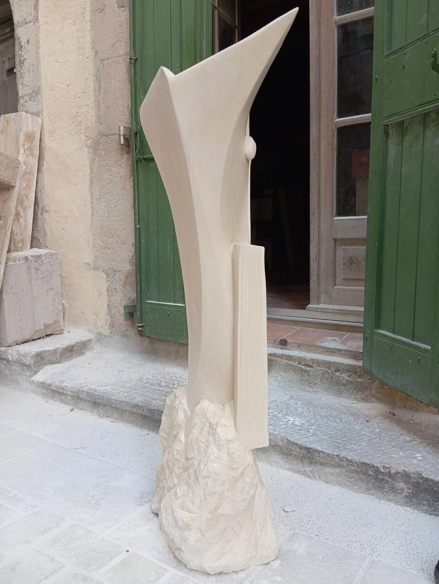 C'est le paradoxe réussi de cet ambon : une forme résolument moderne qui s'intègre parfaitement dans l'église Sainte-Jeanne-d'Arc de Rennes, sans pastiche ni anachronisme. La pierre calcaire, blanche et lumineuse, fait corps avec le message qu'elle porte — la Parole de Dieu, lumière pour les pas de l'homme.