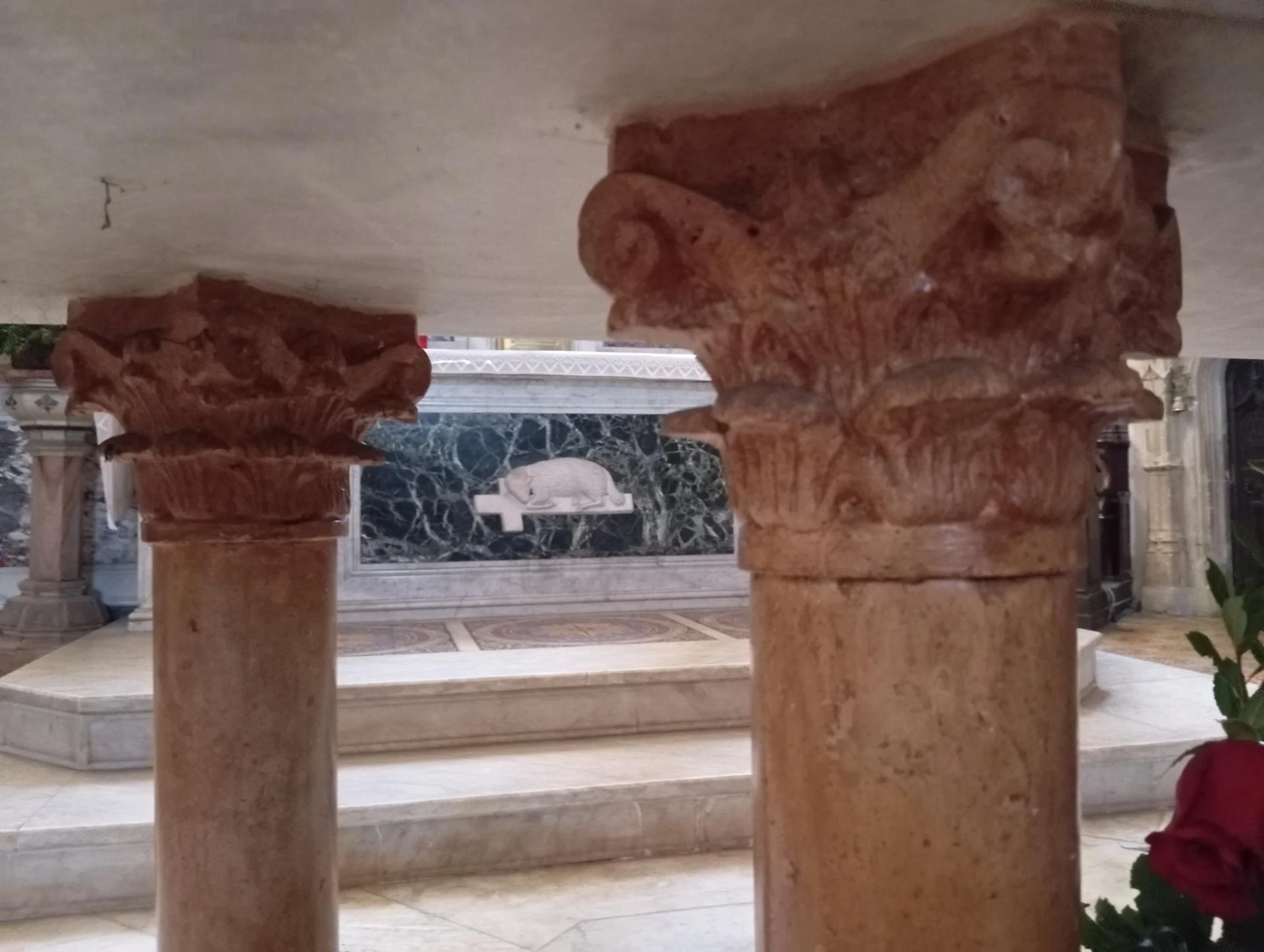 Détail des chapiteaux corinthiens taillés dans la pierre marbrière des Pyrénées. Leur teinte ocre chaude répond aux colonnes du maître-autel baroque de l'église — un dialogue de matière et de couleur qui unit les deux autels dans un même espace liturgique cohérent.