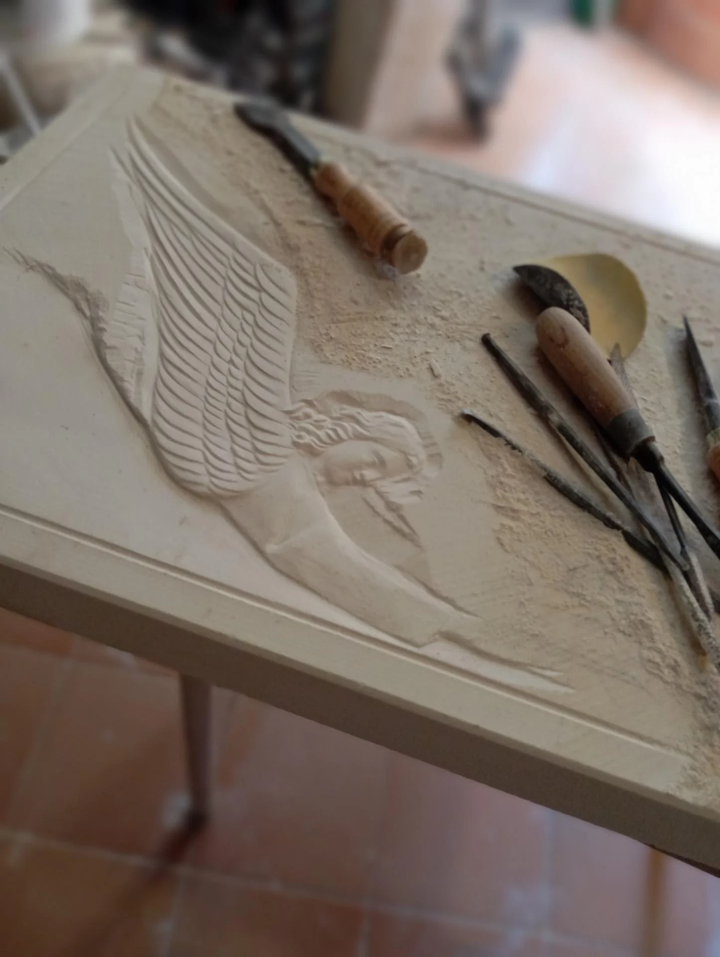 La taille directe s'engage dans la pierre. L'aile de l'ange émerge du calcaire plume par plume, dans un travail de précision qui rappelle les sculptures gothiques des cathédrales — chaque détail, chaque nervure, chaque plume taillée au ciseau fin dans la masse minérale.