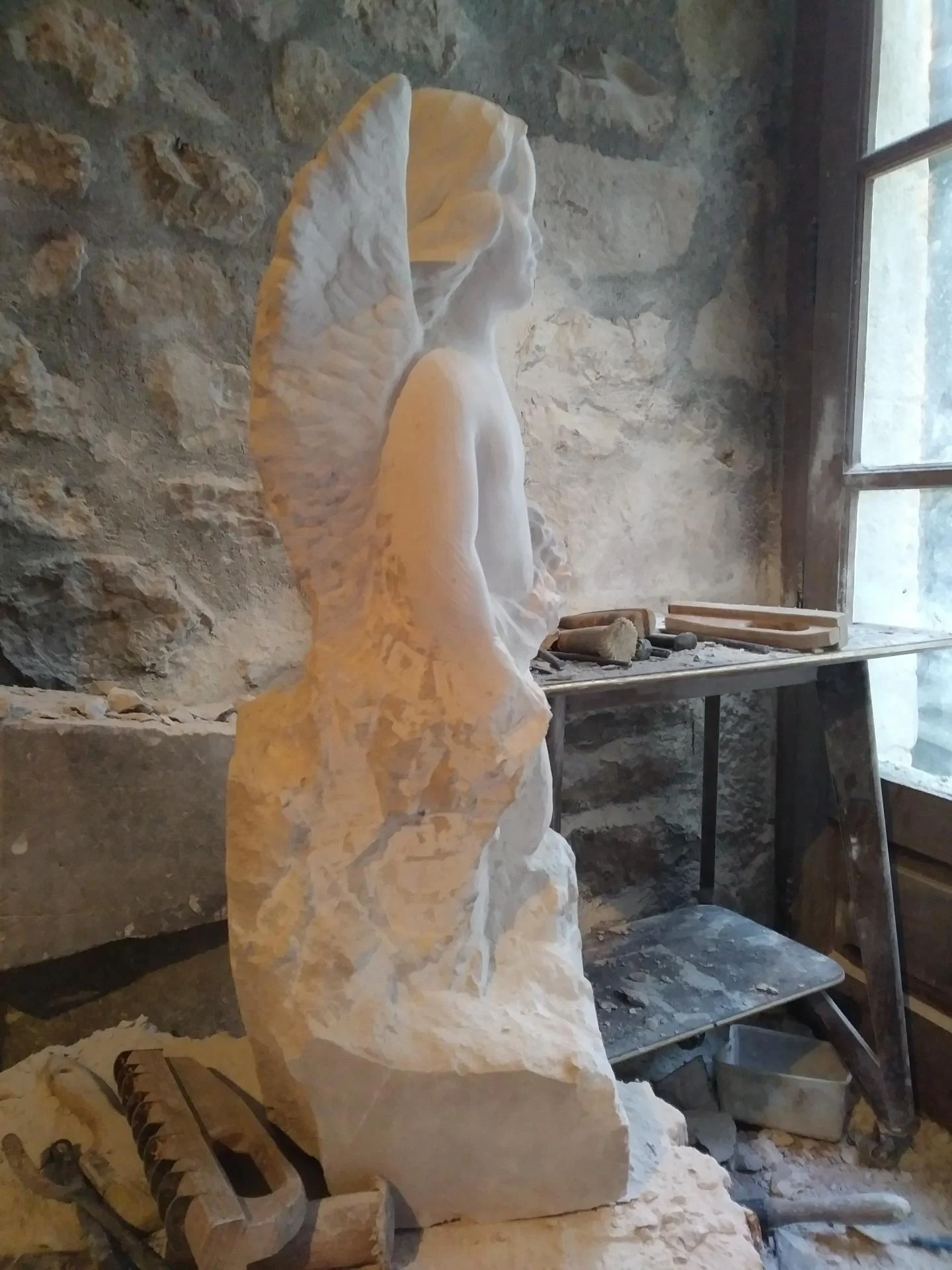 Dans la lumière de l'atelier qui vient de la fenêtre à droite, la silhouette se découpe avec une netteté qui annonce déjà la sculpture finale. On reconnaît la posture — le corps légèrement penché, les ailes déployées, le bras qui porte le bouquet — même si la surface est encore brute par endroits. Cette étape de la taille directe est souvent la plus émouvante : la figure est libérée mais pas encore polie, sauvage encore dans sa matière mais pleinement présente dans sa forme.
